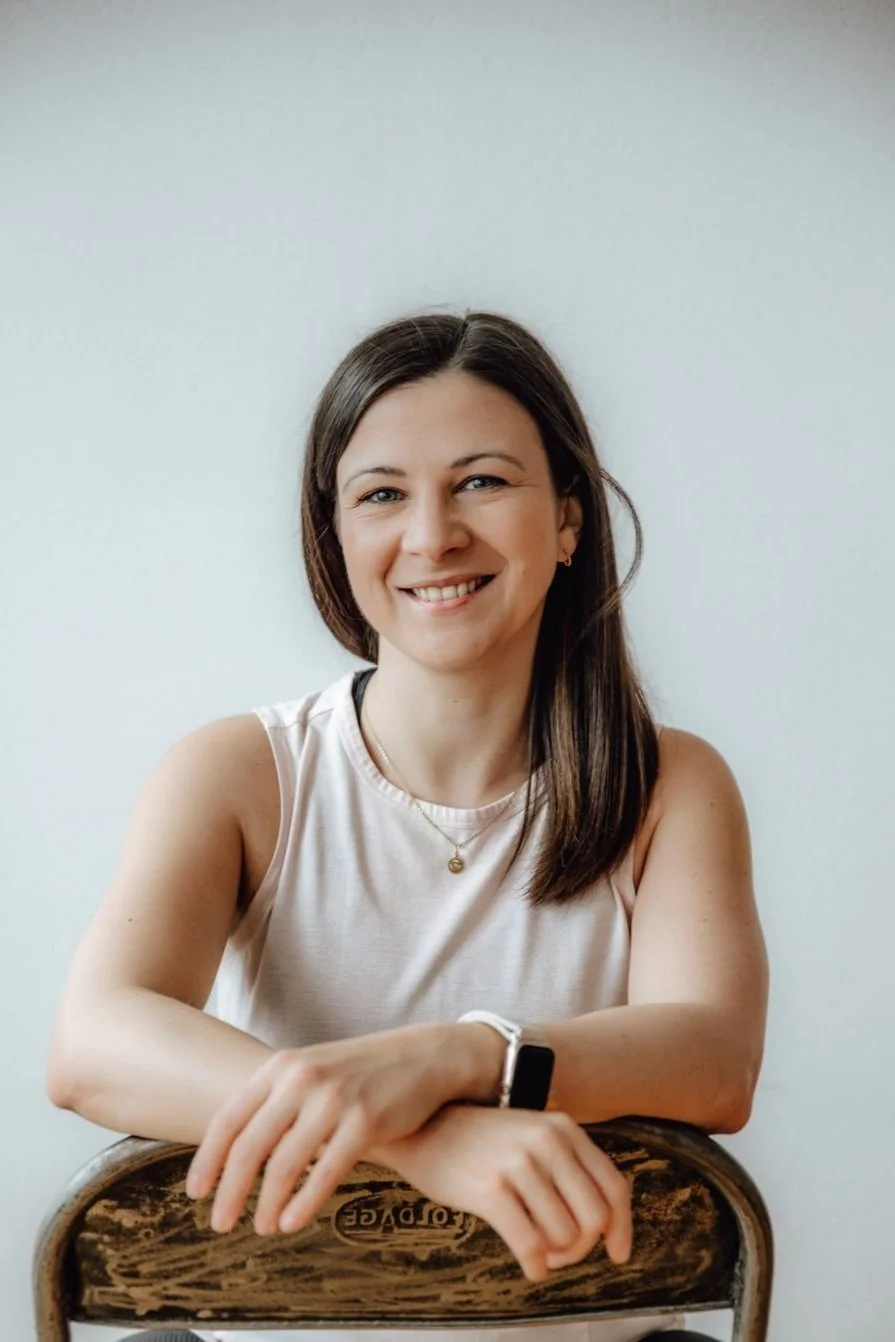 Eine lächelnde Frau sitzt an einem Stuhl, trägt ein weißes Top, einen schwarzen Fitness-Tracker und eine Halskette, vor einem weißen Hintergrund.