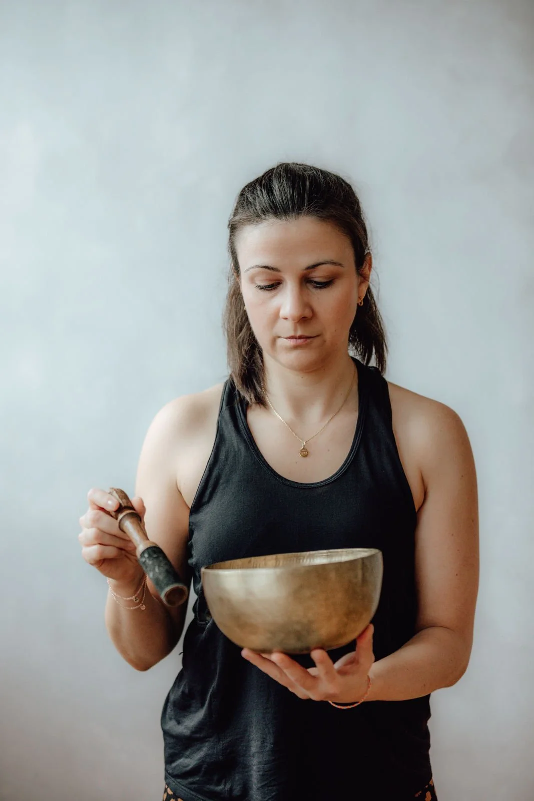 Eine Frau hält eine Klangschale in der Hand und einen Klöppel, steht vor einem hellgrauen Hintergrund.