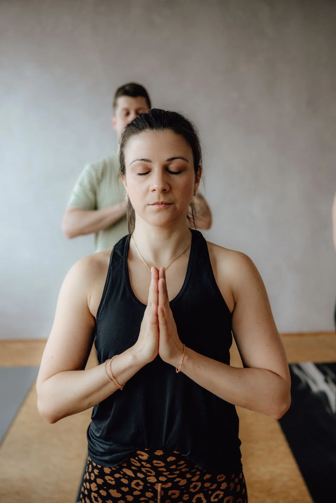 Eine Frau meditiert mit geschloßenen Augen und gefalteten Händen, im Hintergrund steht ein Mann mit verschränkten Armen, in einem Raum mit neutralen Wänden.